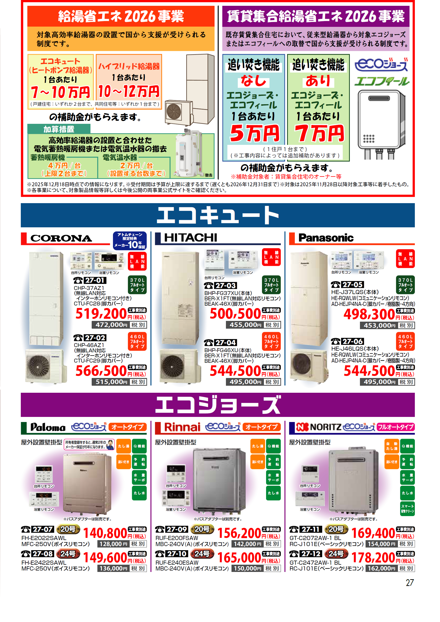 【2026年02月 家電】 給湯機器(エコキュート・エコジョーズ)